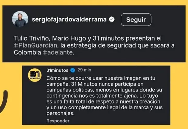 En las últimas horas se generó una fuerte controversia entre el programa infantil chileno 31 Minutos y el aspirante a la presidencia Sergio Fajardo, luego de que este publicara un carrusel promocionando su “Plan Guardián”. En la pieza gráfica se utilizaron personajes icónicos como Tulio Triviño, Juan Carlos Bodoque, Mario Hugo y Juanín Juan Harry, sin autorización de sus creadores.