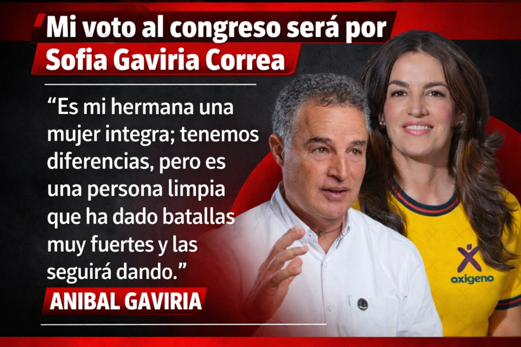 Mi voto al congreso será por Sofia Gaviria Correa . Es mi hermana una mujer integra; tenemos diferencias, pero es una persona limpia que ha dado batallas muy fuertes y las seguirá dando. ANIBAL GAVIRIA